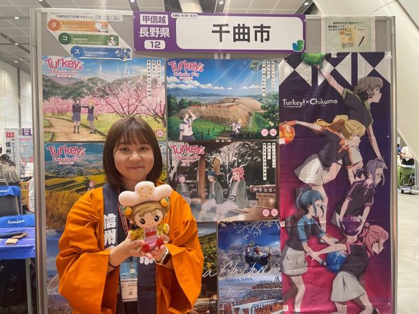 (千曲市のゆるキャラ「あん姫」と千曲市 経済部ふるさと振興課 移住定住推進係の高橋さん)